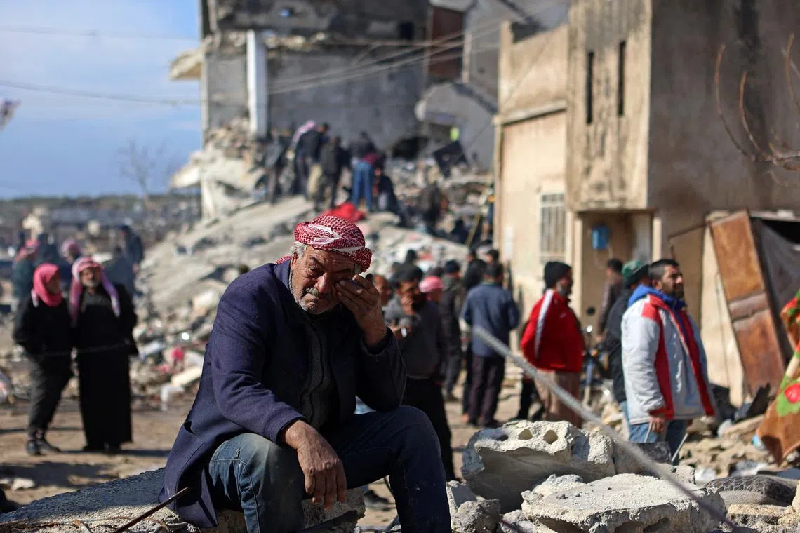 A Syrian man cries as he sits on the rubble of a collapsed building in the rebel-held town of Jindayris, on Feb 7, 2023.