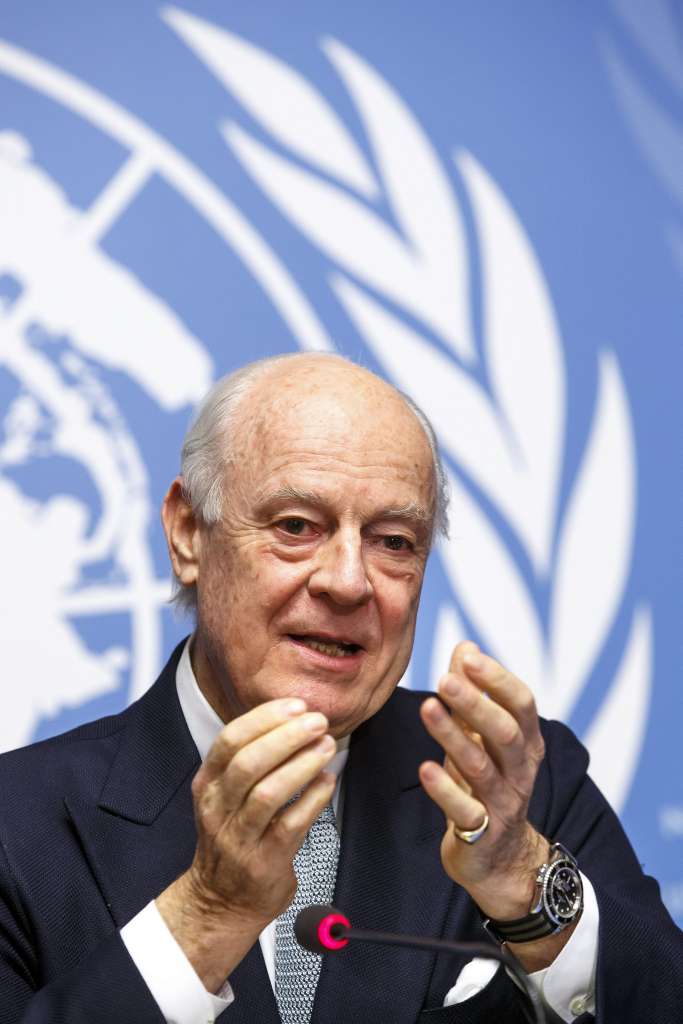 UN Special Envoy of the Secretary-General for Syria Staffan de Mistura informs the media on the Intra-Syrian Talks, during a press conference, at the European headquarters of the United Nations in Geneva, Switzerland, 25 January 2016.