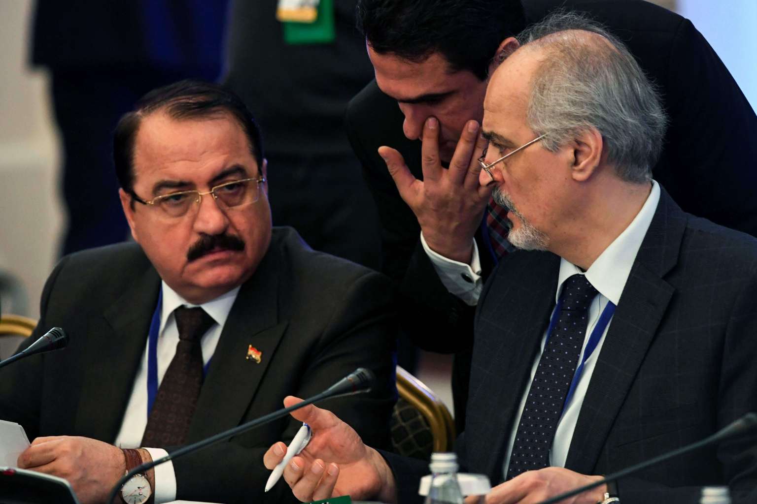 Syria's UN ambassador and head of the regime delegation Bashar al-Jaafari (right) speaking with Syrian ambassador to Russia Riad Haddad prior to the first session of Syria peace talks.