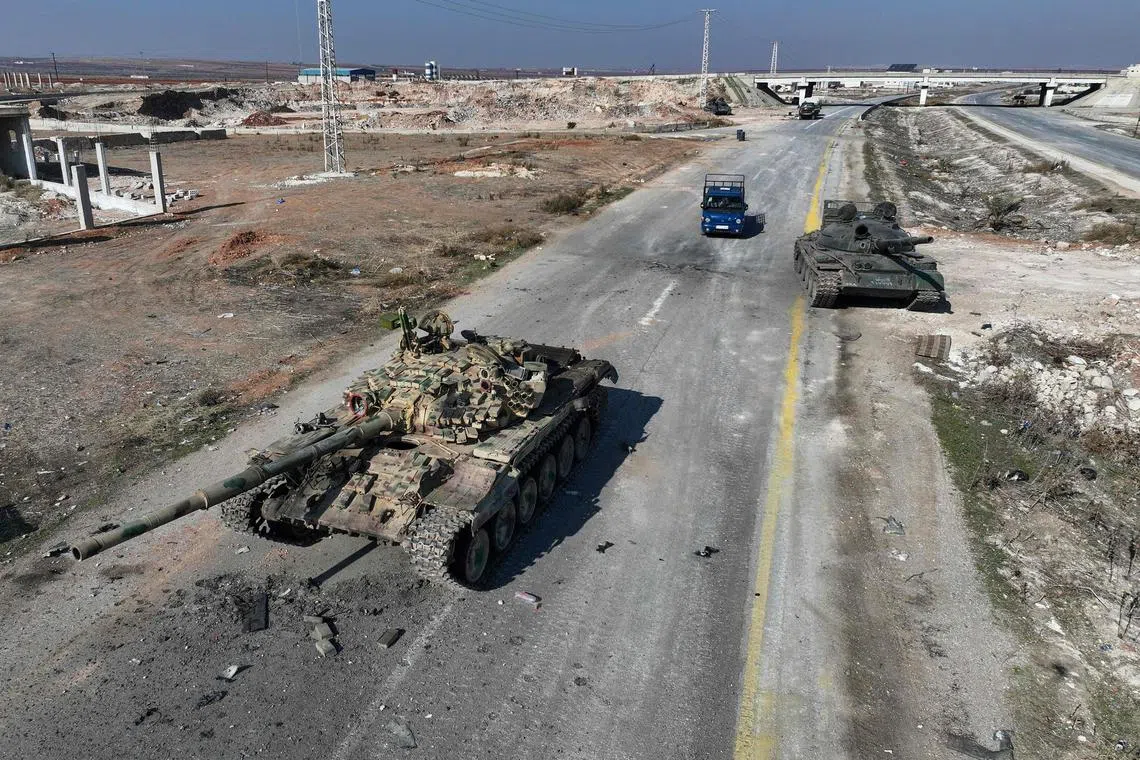 A car driving past military equipment abandoned by the Syrian army on the highway to Damascus, north of Hama city, on Dec 3.