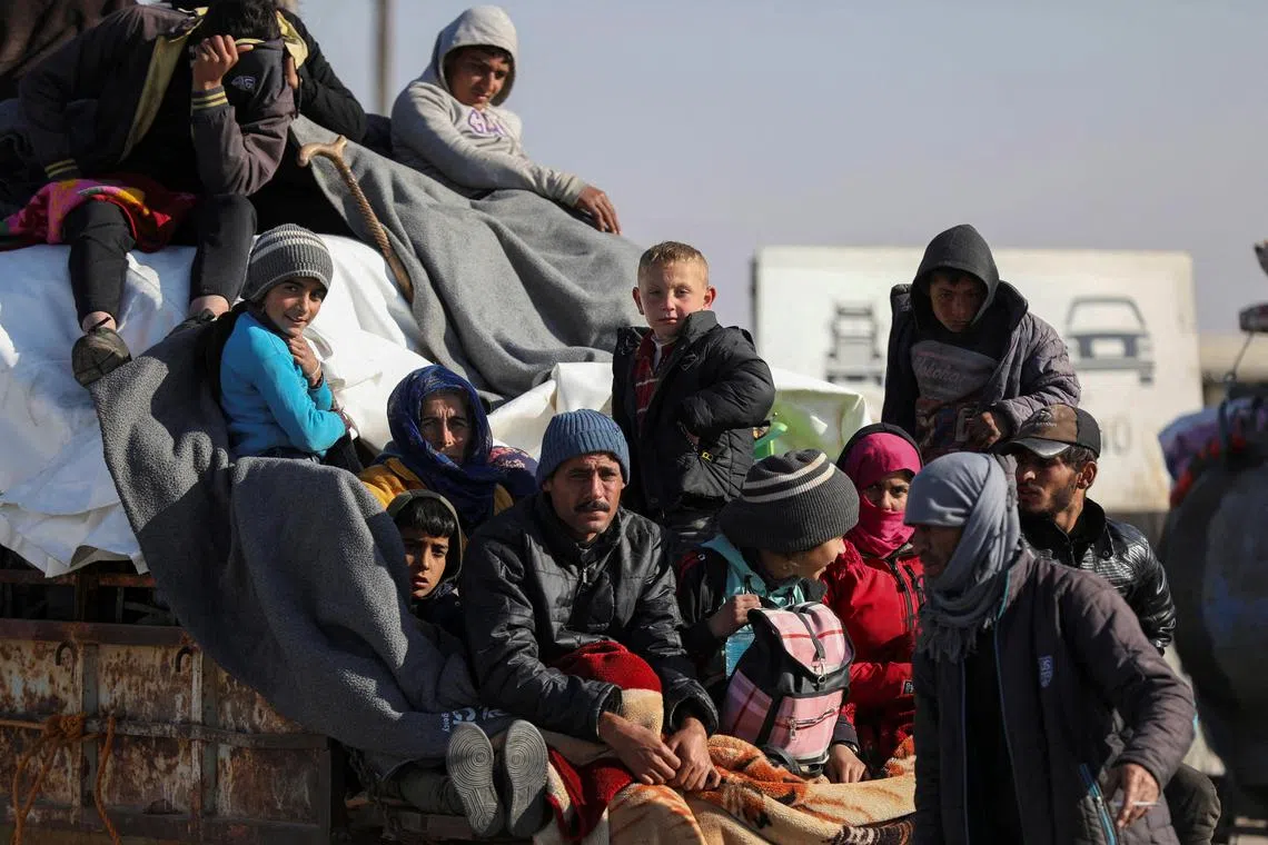 People displaced from the countryside around Aleppo sitting together on the back of a truck in Tabqa, Syria, on Dec 3, 2024.