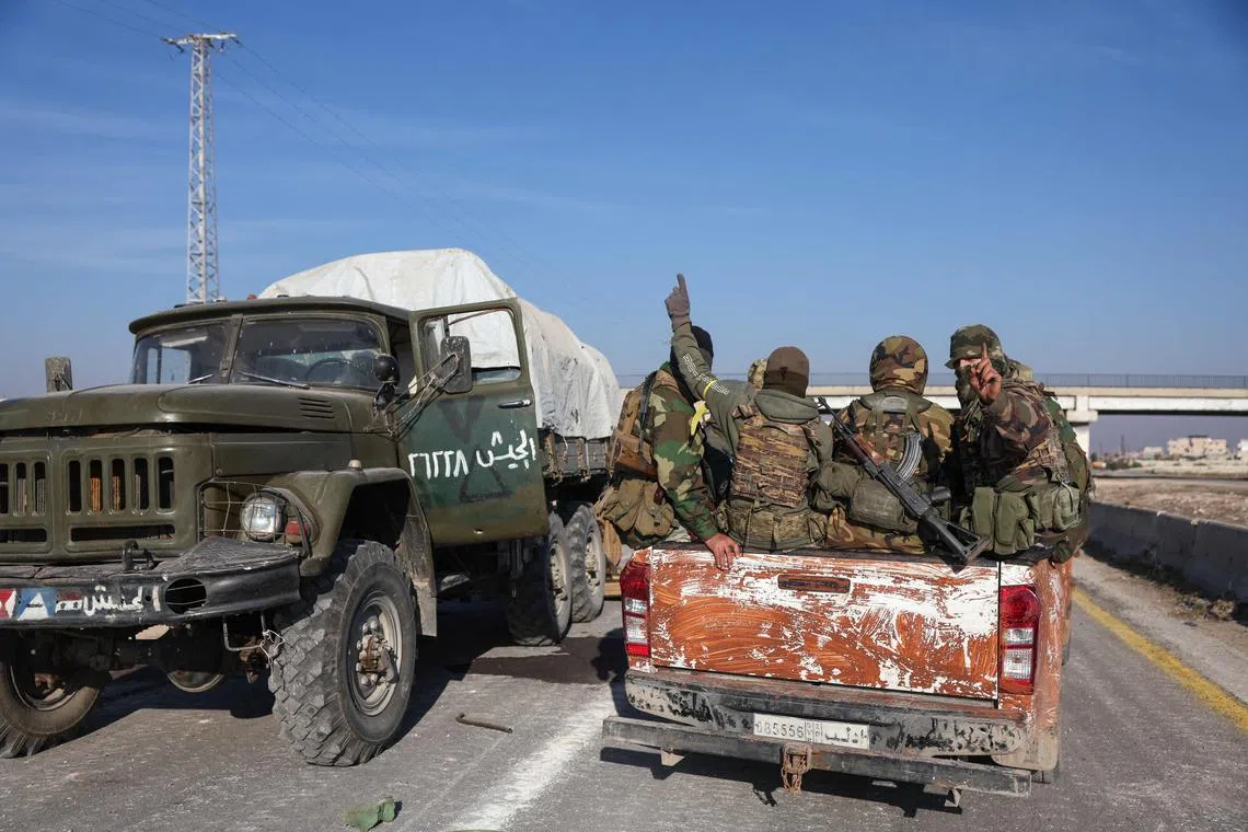 Anti-government fighters taking possession of military equipment and vehicles abandoned by the Syrian army on the highway to Damascus, on Dec 3.