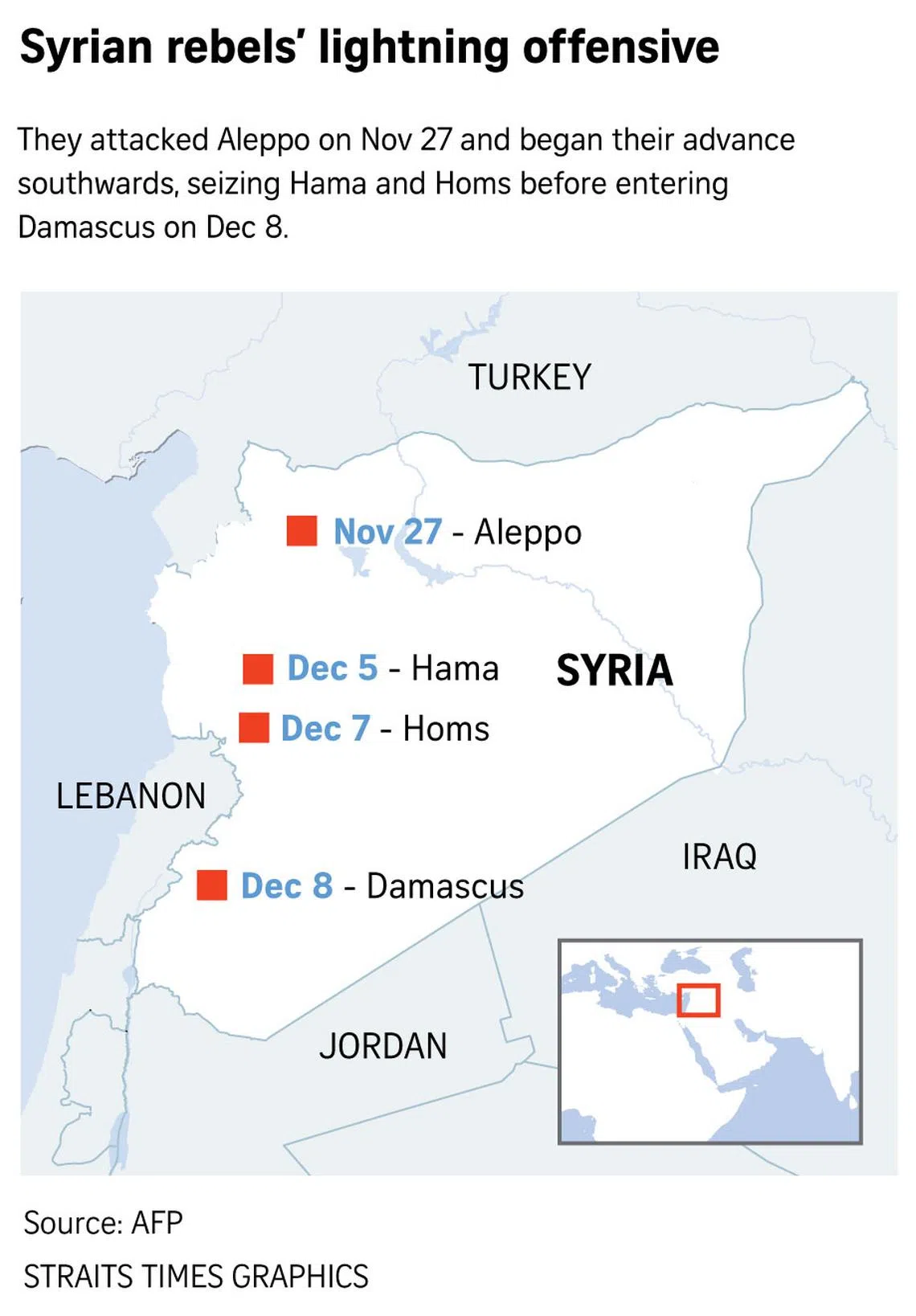 Lebanon-based Hezbollah, which provided crucial support to Mr Assad for years, withdrew all of its forces from Syria on Dec 7 as rebel factions approached the capital Damascus, two Lebanese security sources told Reuters on Dec 8.