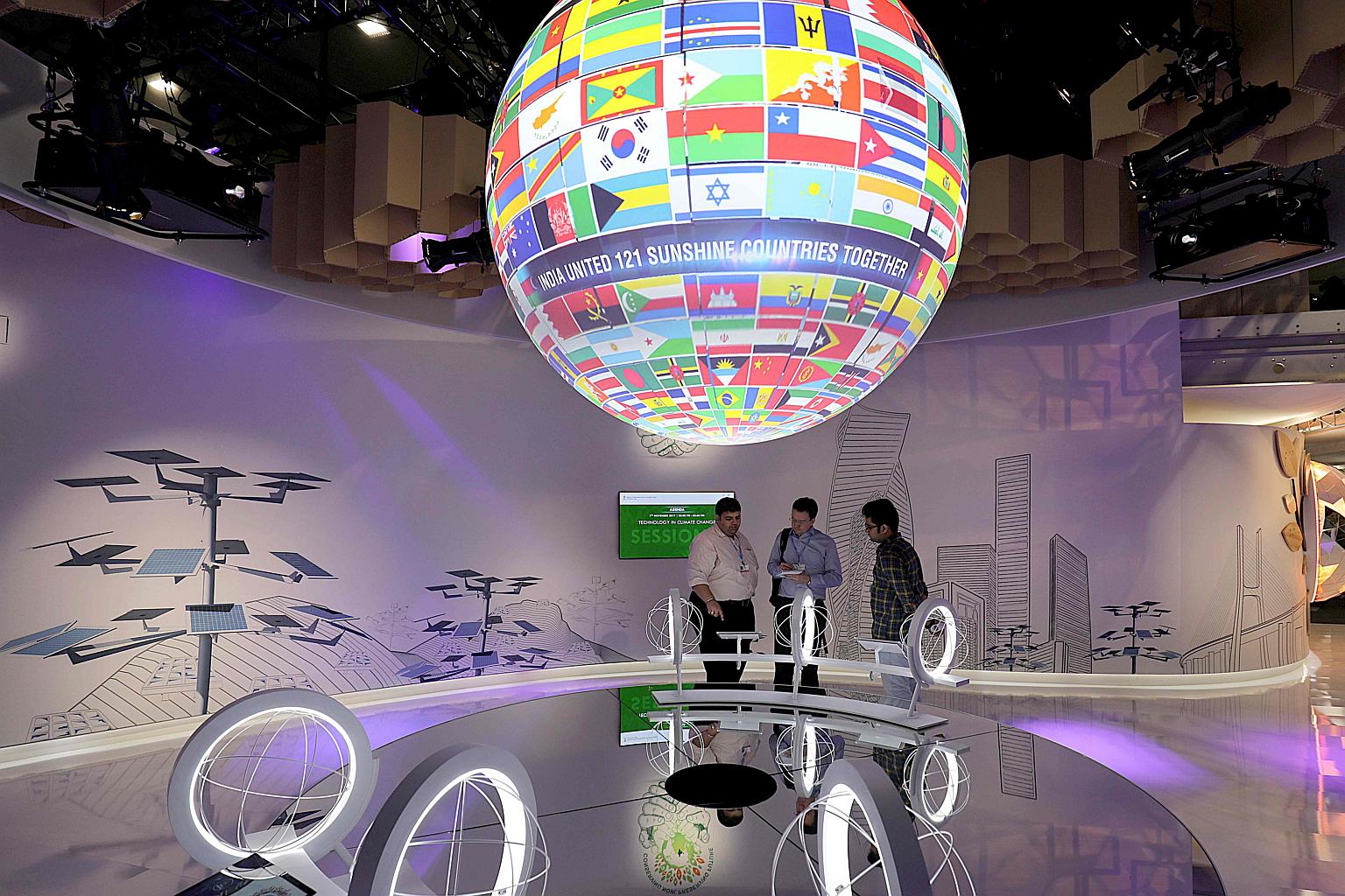 Visitors stand beneath a spinning globe with the flags of the nations during the COP23 United Nations Climate Change Conference.
