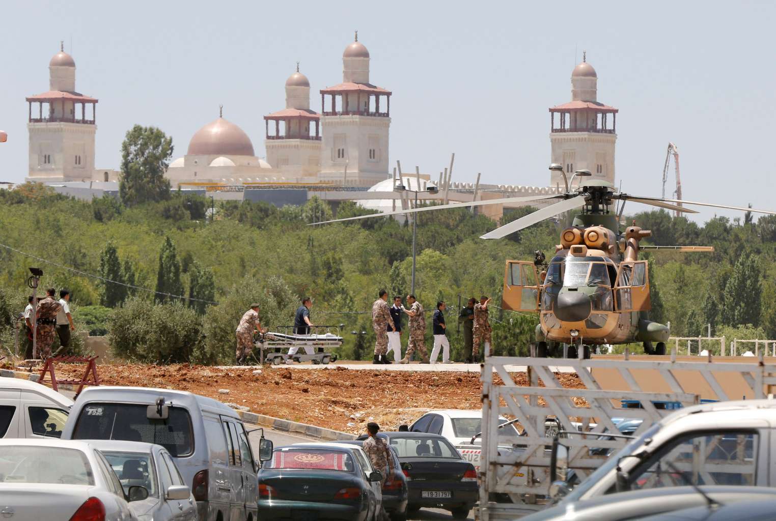 A security member, who was injured during an attack at a camp for Syrian refugees is transported from a military helicopter in Amman, Jordan, on June 21, 2016.
