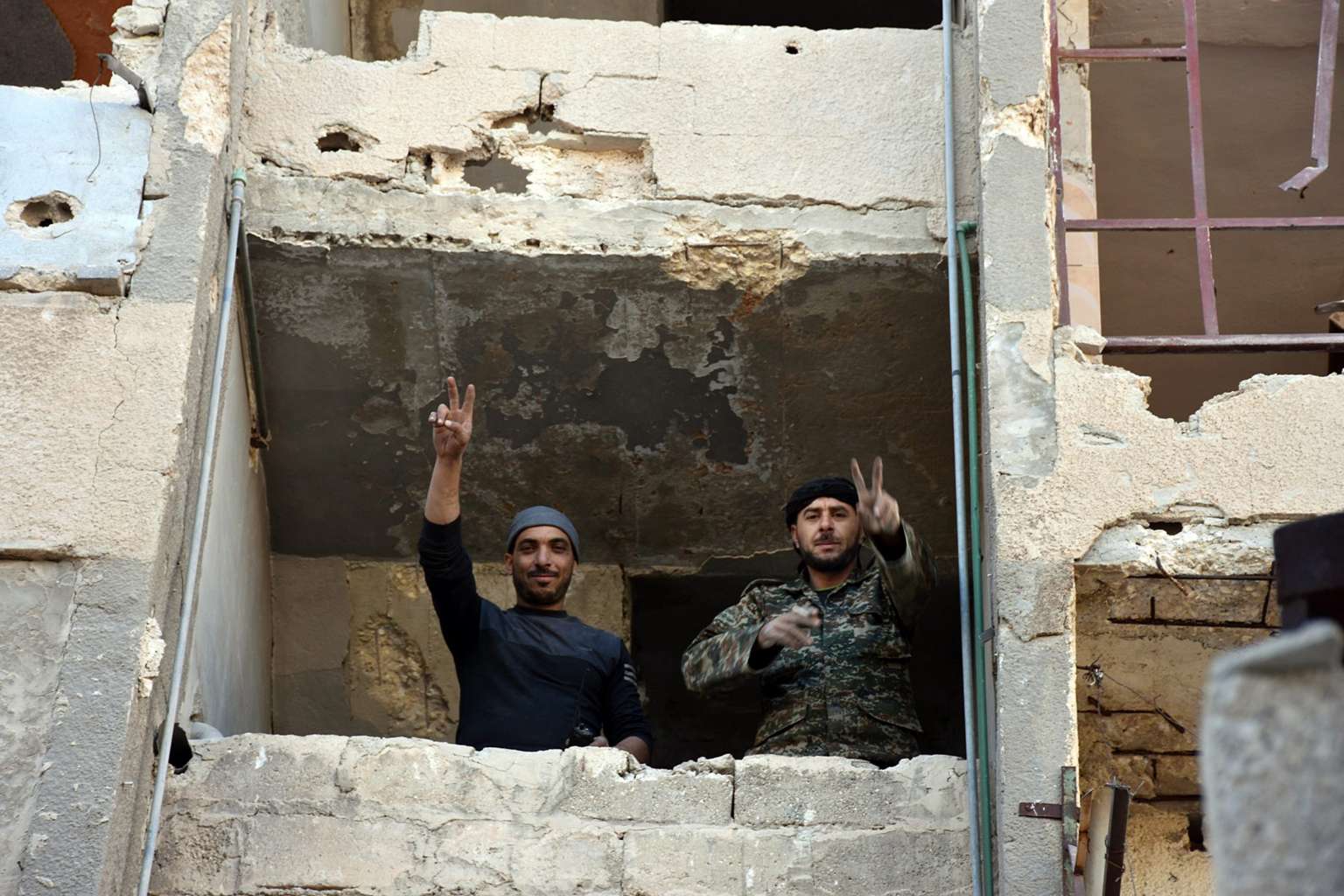 A handout picture made available by the official Syrian Arab News Agency shows Syrian soldiers making a V for victory sign from a window of damaged building in Aleppo's eastern Masaken Hanano area in Aleppo province on Nov 27, 2016.
