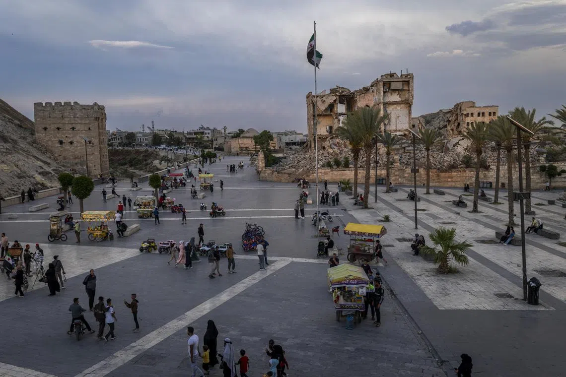 People walking around in Aleppo, Syria, on May 14. The Syrian security forces raided Islamic State hideouts in the city on May 17.