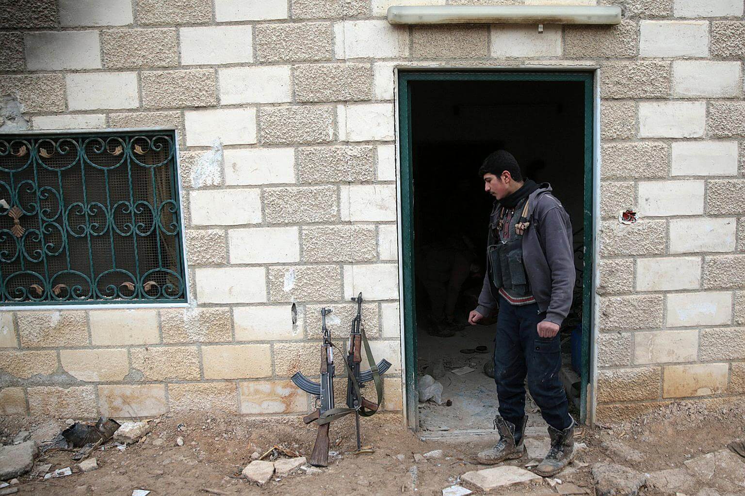 A rebel fighter standing near weapons on the forth day of the truce, on al-Rayhan village front near the rebel held besieged city of Douma, in the eastern Damascus suburb of Ghouta, Syria, on Jan 2, 2017.