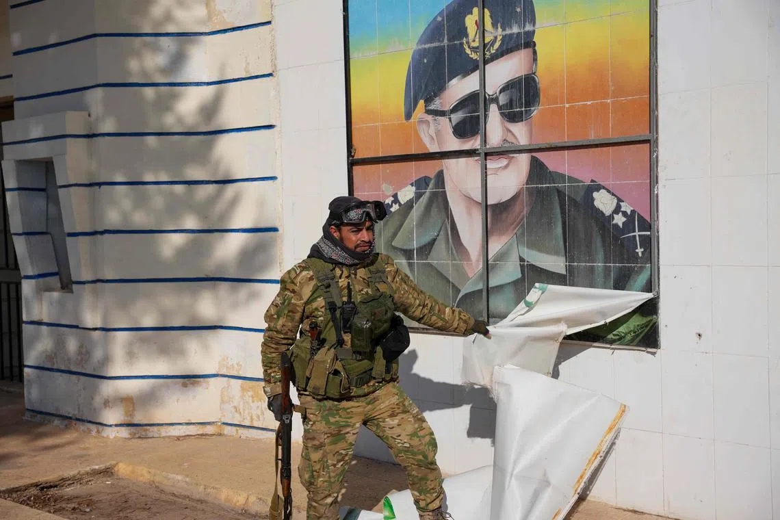 An anti-government fighter standing next to a portrait of former president Hafez al-Assad at the Kweyris military airfield in the eastern part of Aleppo province on Dec 3.