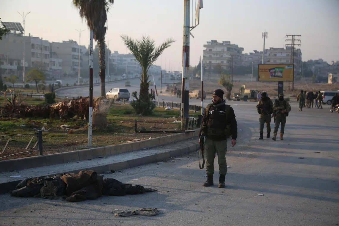 Opposition fighters walking near the covered body of a Syrian soldier after entering the city of Hama, Syria, on Dec 6.