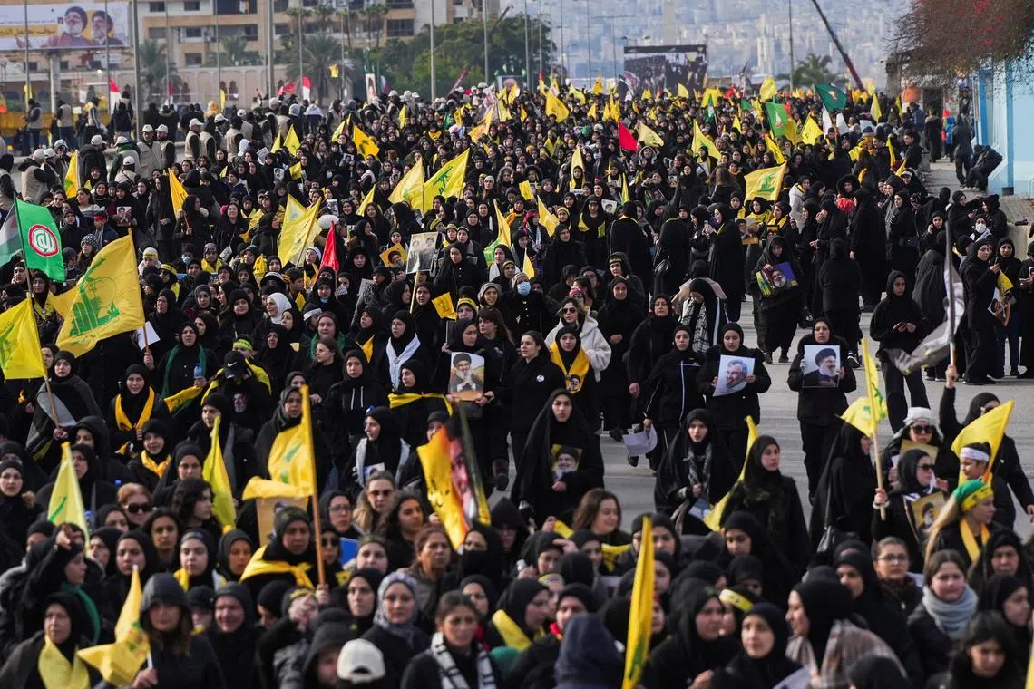 People marching in Beirut on the day of a public funeral ceremony for late Hezbollah leaders Hassan Nasrallah and Hashem Safieddine.