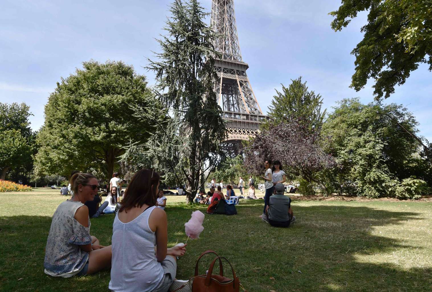 A woman eats a pink candy floss in front of the Eiffel Tower on Aug 13, 2016 in Paris.
