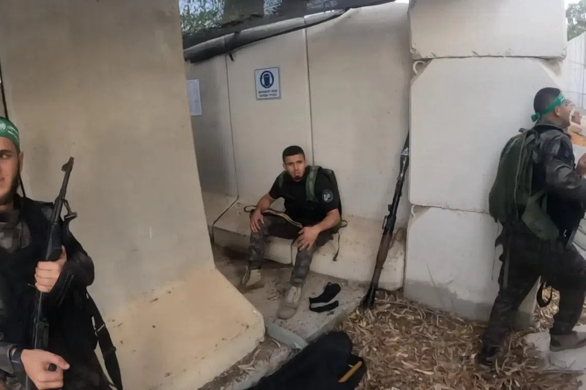 An image taken from a video filmed by a Hamas commander who was killed on Saturday. The gunmen are seen inside an Israeli intelligence hub.