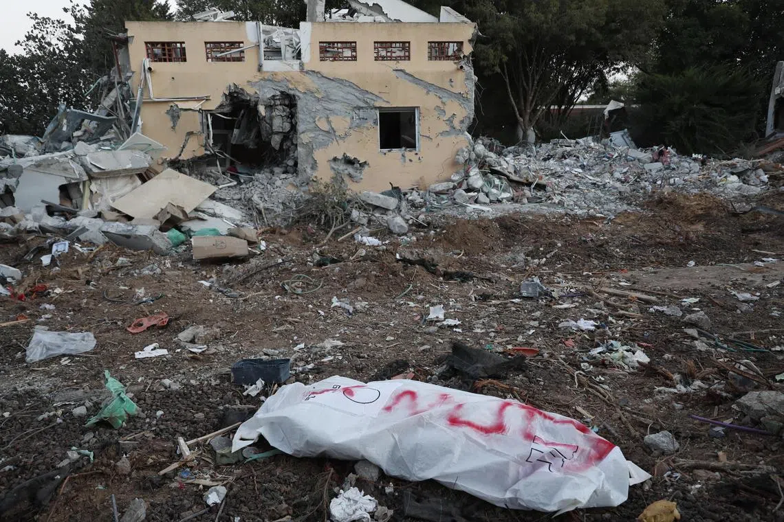 The body of a Hamas militant lying on the ground in Be’eri, Israel.