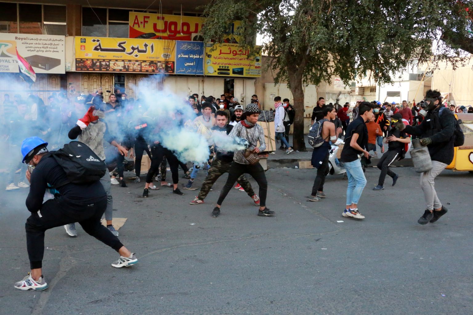 Protesters react after anti-riot police fired tear gas at them during a protest at the Al-khilani square in central Baghdad, Iraq, on March 1, 2020.