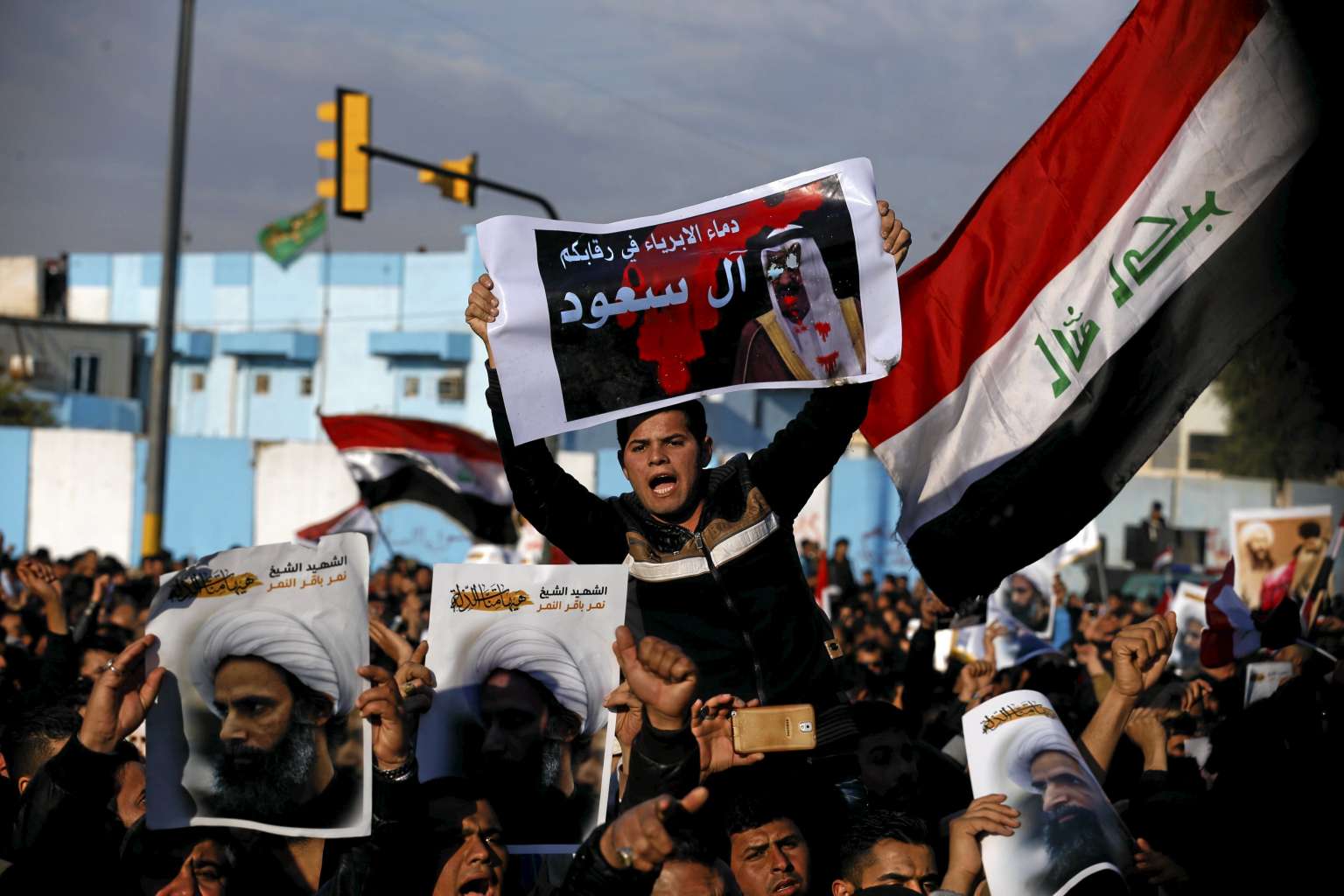 A protest against the execution of Shi'ite Muslim cleric Nimr al-Nimr in Baghdad on Jan 4, 2016.