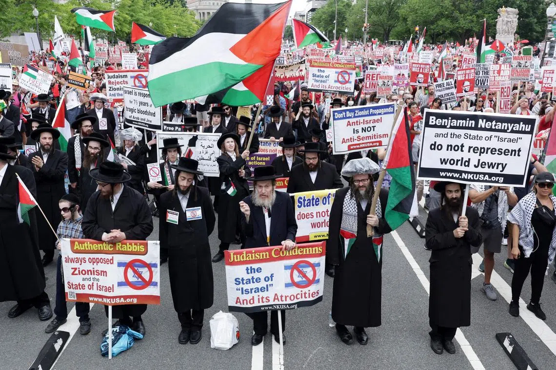Members of an ultra-Orthodox Jewish group carried Palestinian flags and signs reading "Free Palestine" and "Anti-Zionism is not antisemitism," while a group of younger protesters danced to Arabic music and carried large banners reading "Stop Arming Israel and "Stop War Crimes in Gaza."