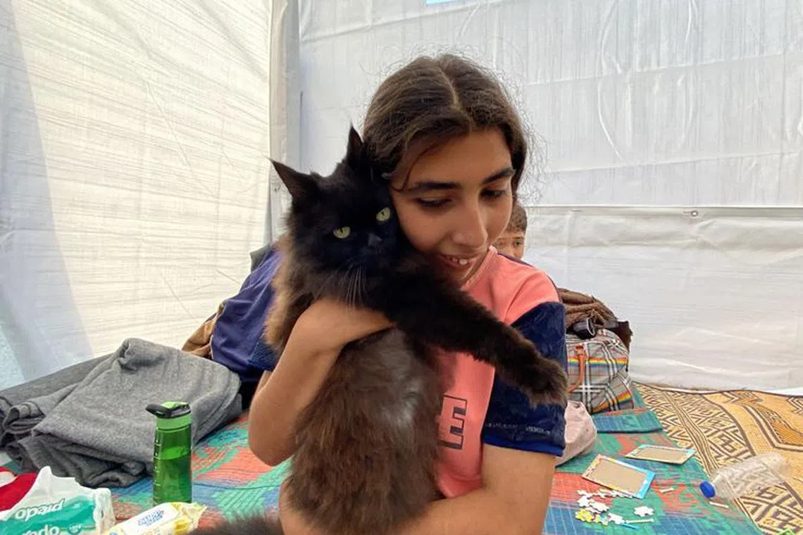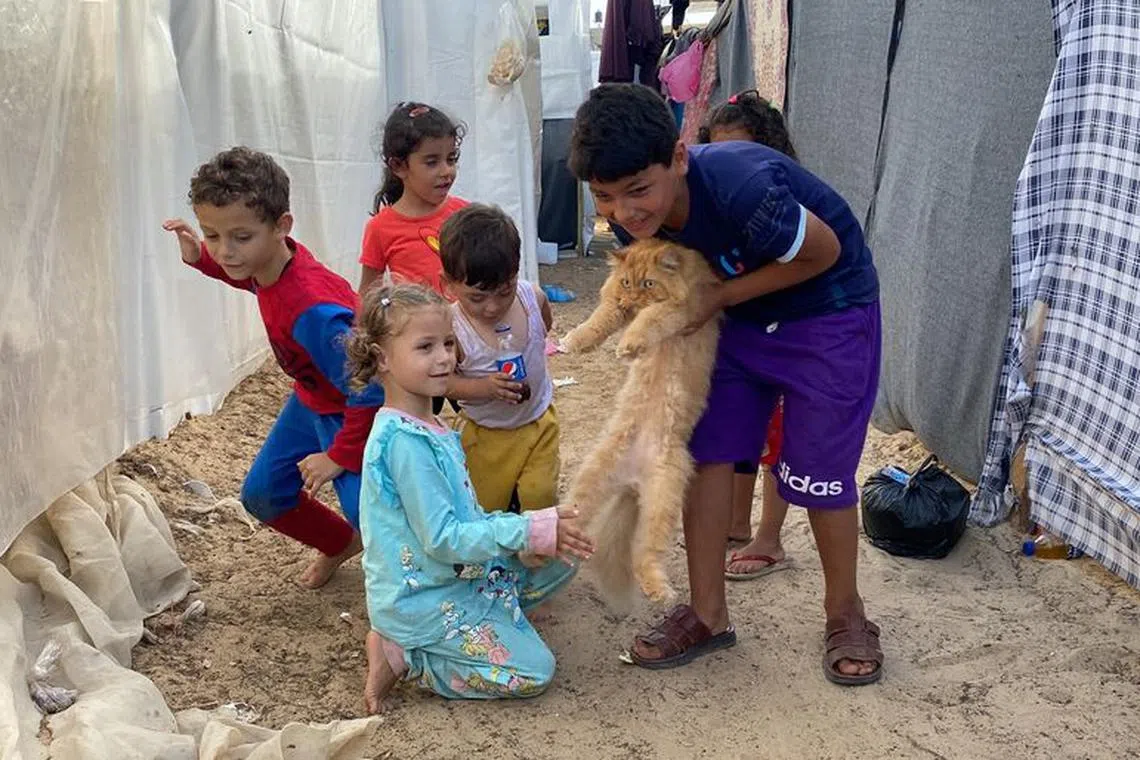 KHAN YOUNIS, Gaza Strip - In a makeshift tent city in the southern Gaza Strip teeming with thousands of displaced people, three cats called Simsim, Brownie and Liza are giving rare moments of joy to children who have lost any semblance of normality in their lives.