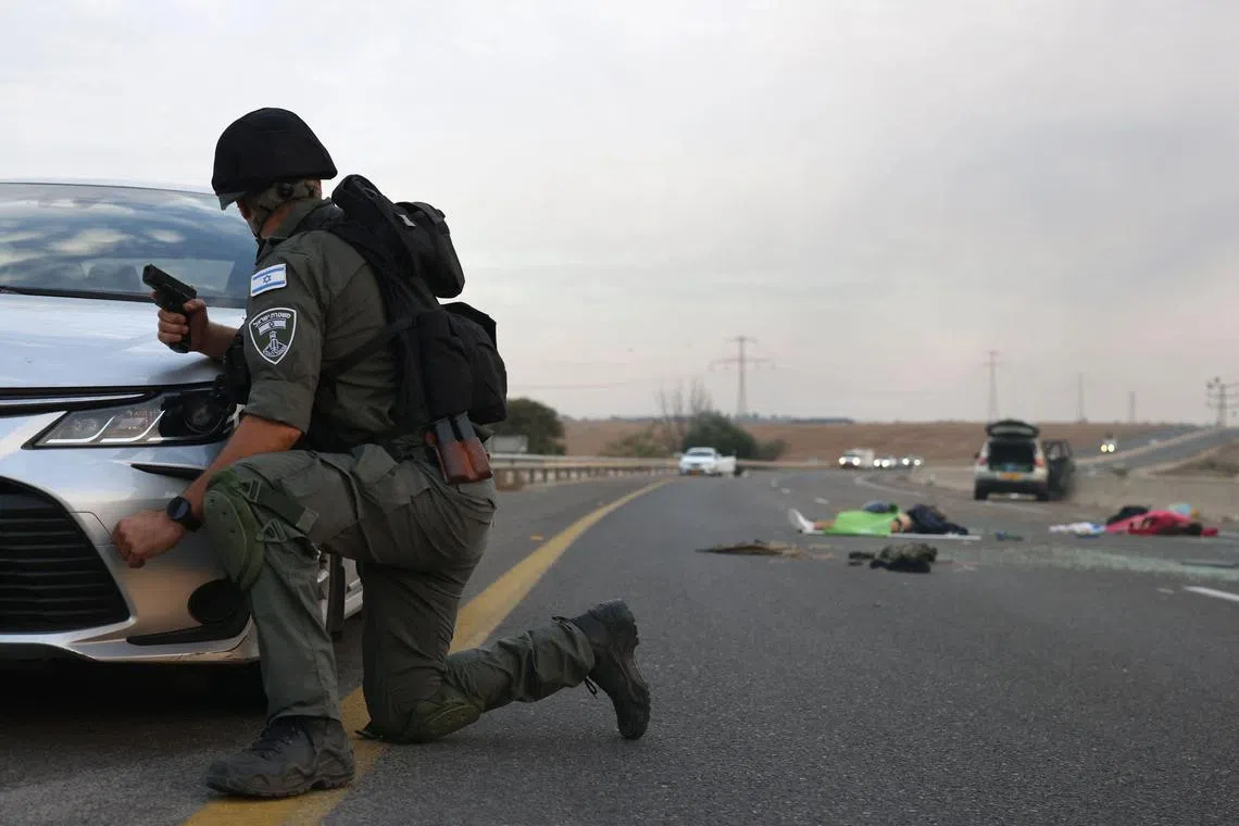 An Israeli soldier take cover behind a car as he looks towards bodies on a main road near the Gevim Kibbutz, close to the border with Gaza.