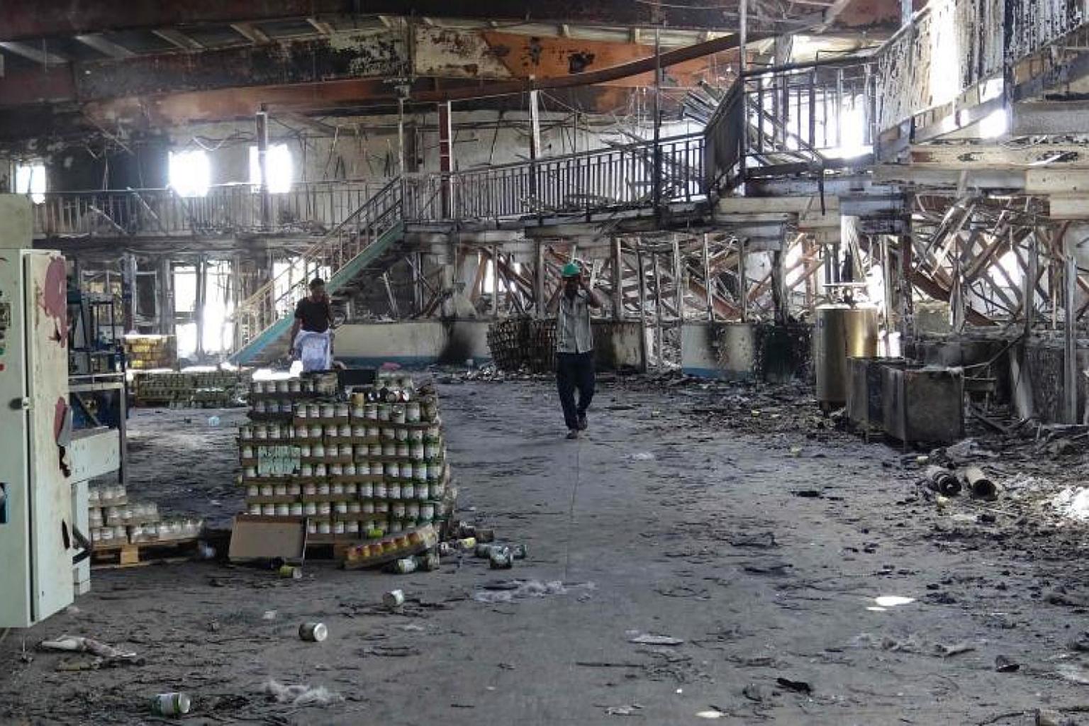 A man stands amidst the rubble in a factory damaged by clashes between the Yemeni Saudi-backed government forces and Iran-aligned Huthis.