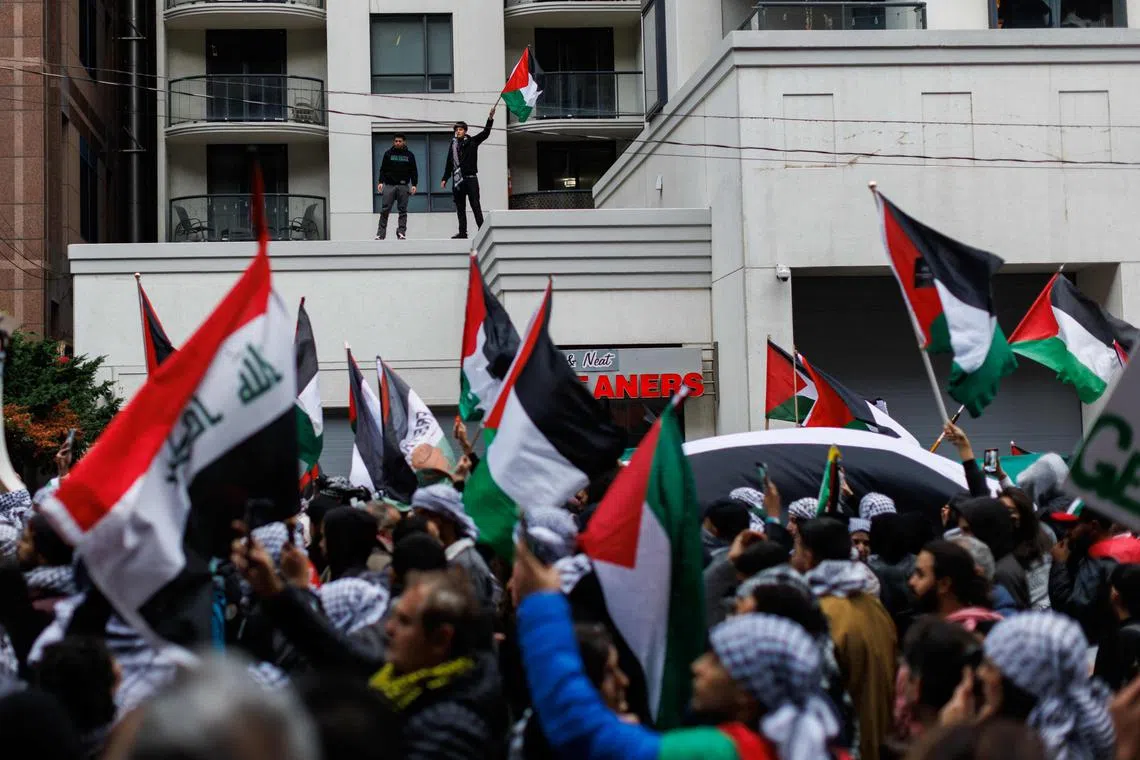Demonstrators in support of Palestinians wave Palestinian flags during a protest in Toronto, Ontario, on Oct 9.