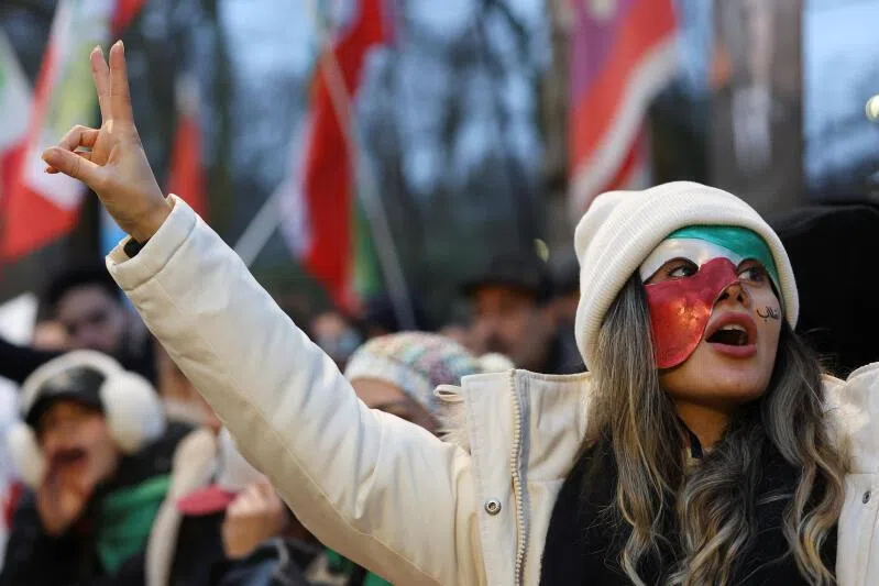 A demonstrator outside the Iranian embassy during a rally in support of nationwide protests in Iran, in London, Britain, on Jan 12, 2026.