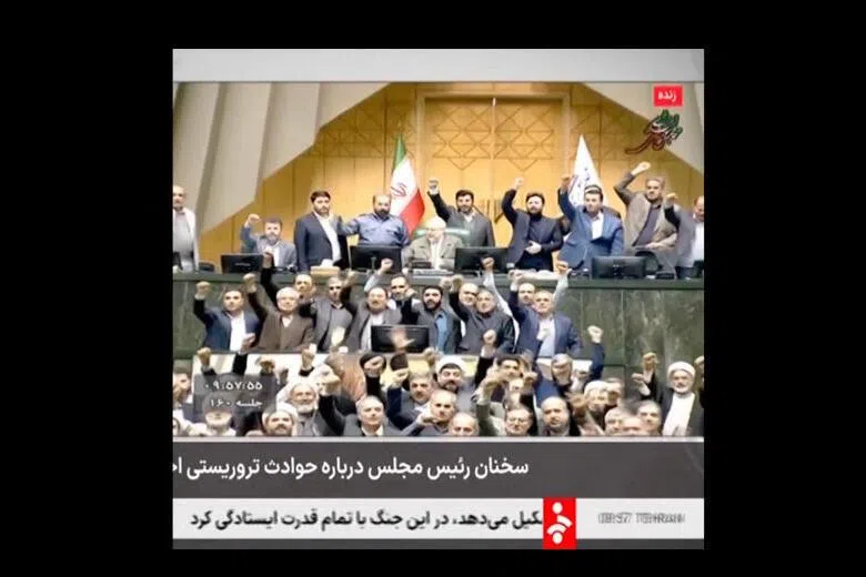 Members of Iran’s Parliament chanting and gesturing around Parliament Speaker Mohammad Baqer Qalibaf (centre, top) as he speaks about Iran's response to possible US attacks, in Tehran, Iran, on Jan 11, 2026.