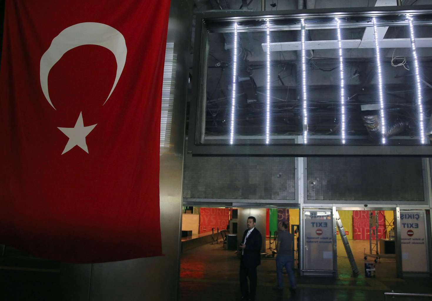 Workers repair the damaged parts of the terminal building at Turkey's largest airport, Istanbul Ataturk, following Wednesday's (June 28) blast on June 29, 2016.