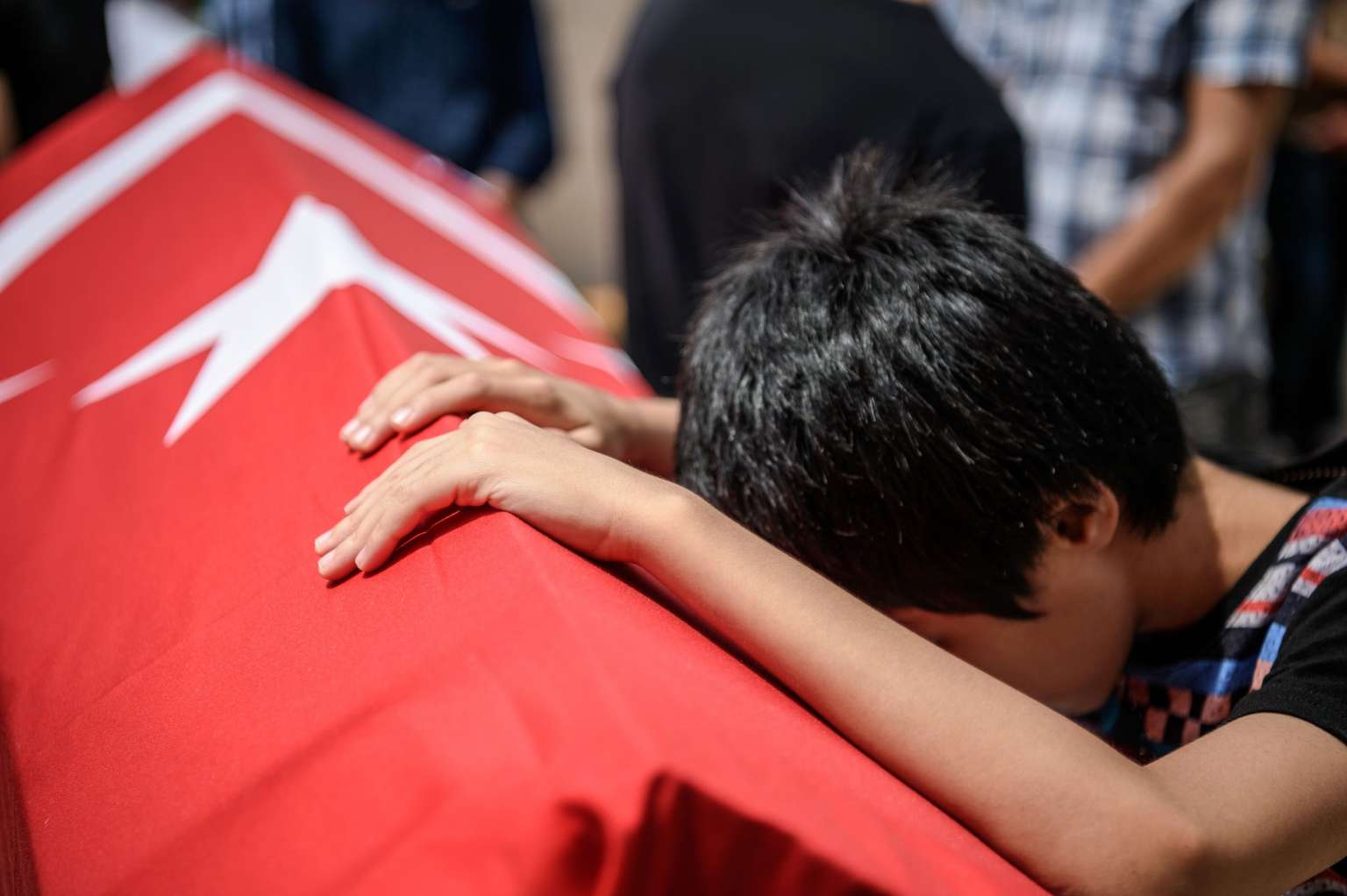 A child leans on the coffin of his uncle, suicide attack victim Hamidullah Safar on June 30, 2016 in Istanbul.