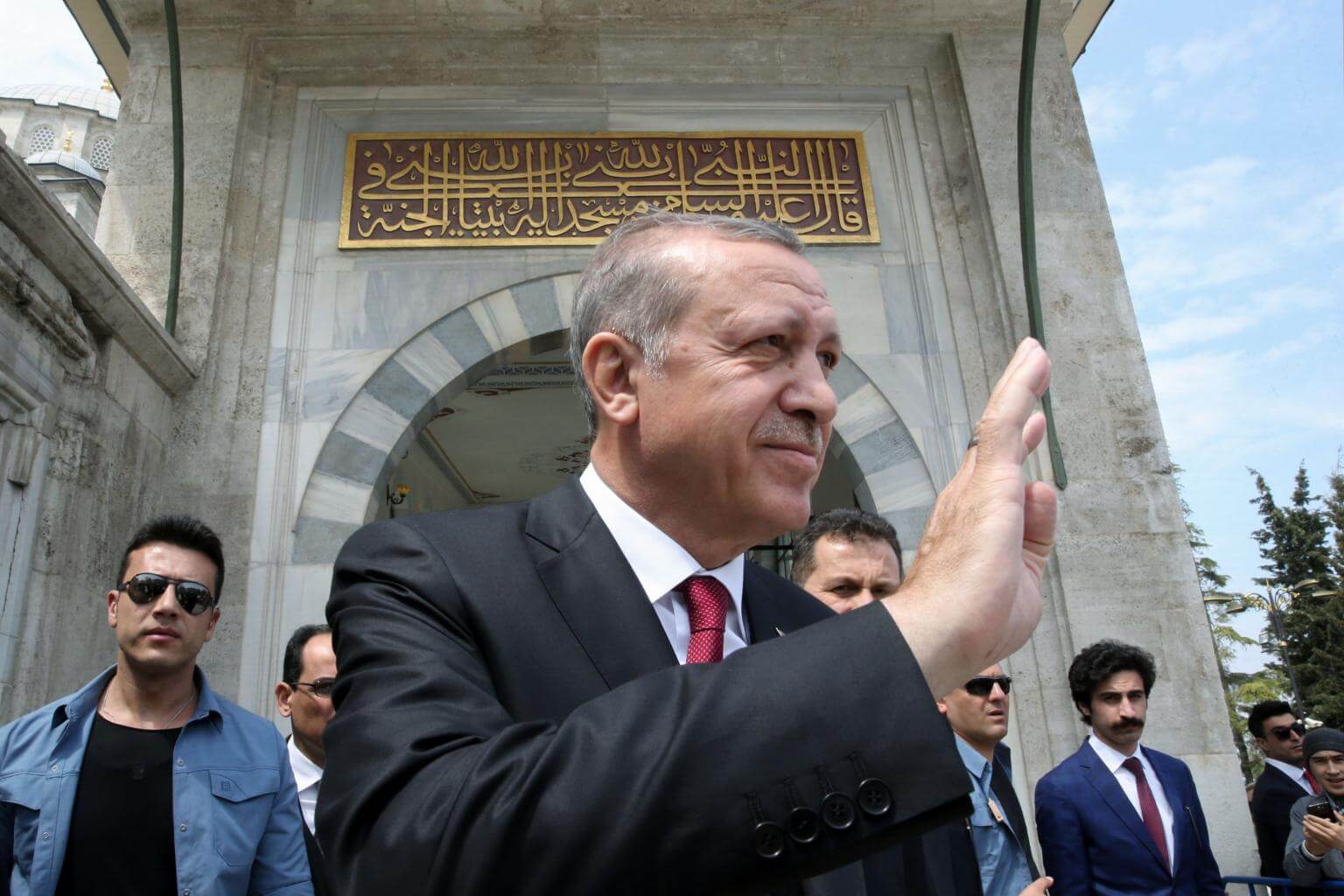 Turkish President Recep Tayyip Erdogan (centre) greeting his supporters during a visit to the Ottoman Fatih Sultan Mehmet's tomb in Istanbul, a day after his victory in a national referendum.