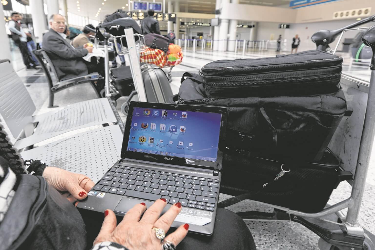 A Syrian woman travelling to the United States through Amman opens her laptop before checking in at Beirut international airport.