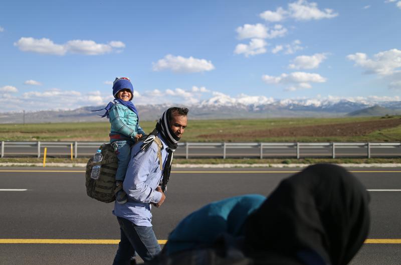 An Afghan refugee, carrying his baby, arrives in Turkey along a route in Erzurum on April 23, 2017.