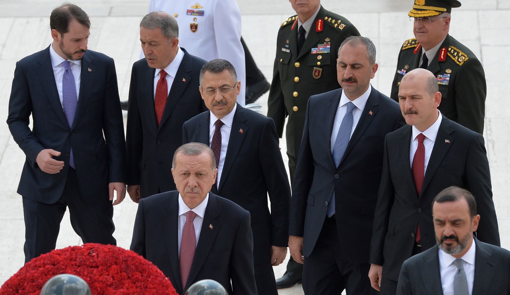 Erdogan (front, left), Soylu (back, right) and Gul (back, second-right) join other Cabinet ministers for a ceremony in Ankara.