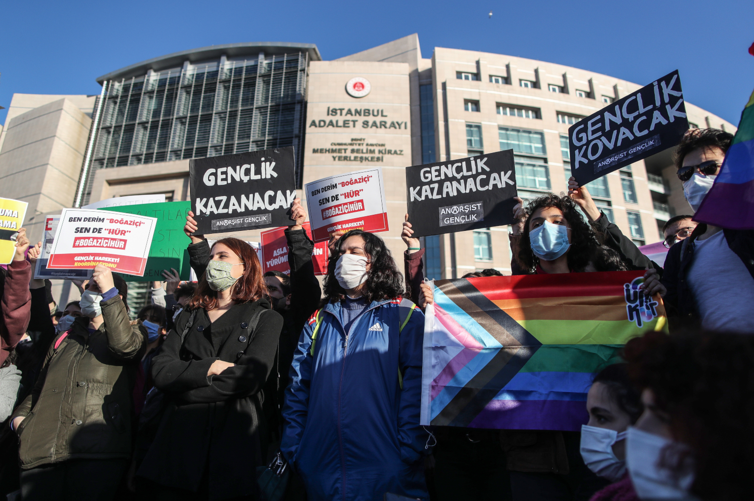 Students of Bogazici University hold placards and shout slogans in front of the Istanbul Courthouse, on Feb 3, 2021.