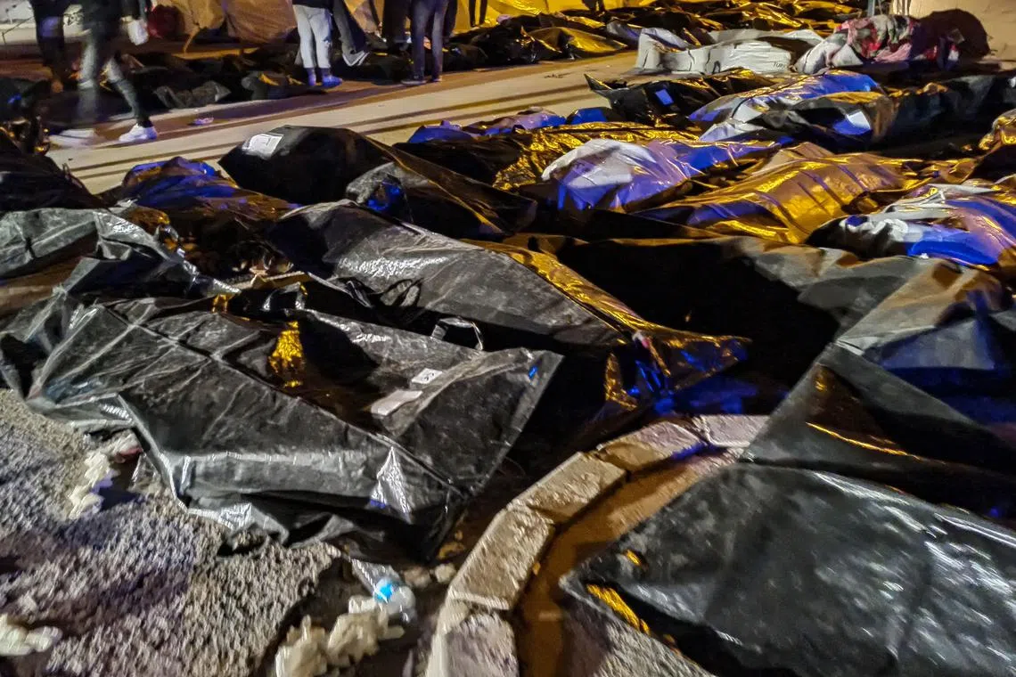 Body bags outside the state hospital of Hatay, Turkey, on Feb 8, 2023.