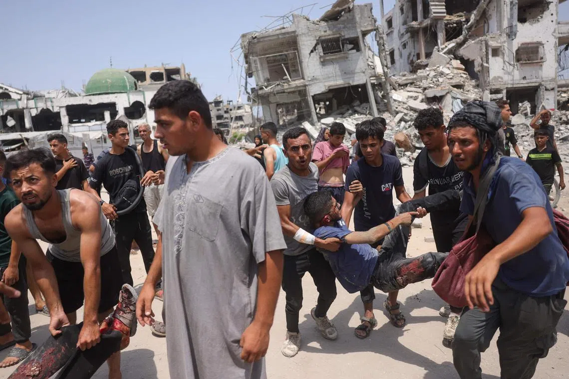 Palestinians carrying casualties of Israeli strikes near an aid distribution centre in the northern Gaza Strip on Aug 13.