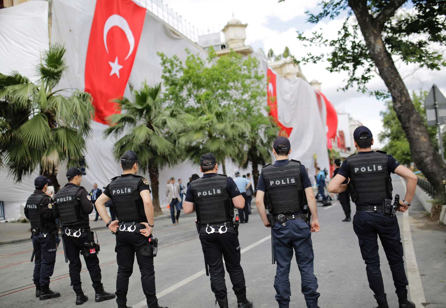 Turkish policemen stand near a hotel building a day after a bomb explosion in Vezneciler district of Istanbul on June 8, 2016.