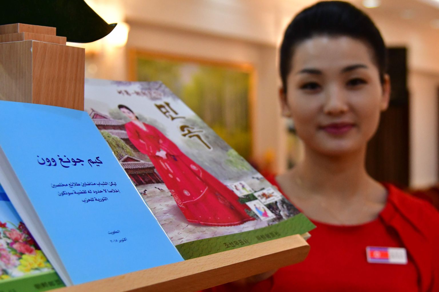 A waitress poses by a book entitled in Arabic "Kim Jong Un", at a North Korean restaurant in Dubai.