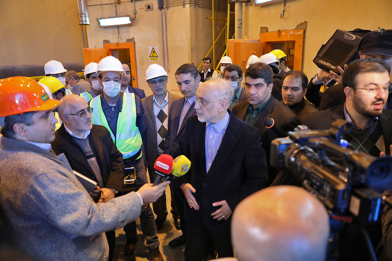 A 2019 photo shows the head of Iran's Atomic Energy Organisation, Ali Akbar Salehi (centre), visiting the Arak nuclear plant, south of Teheran.