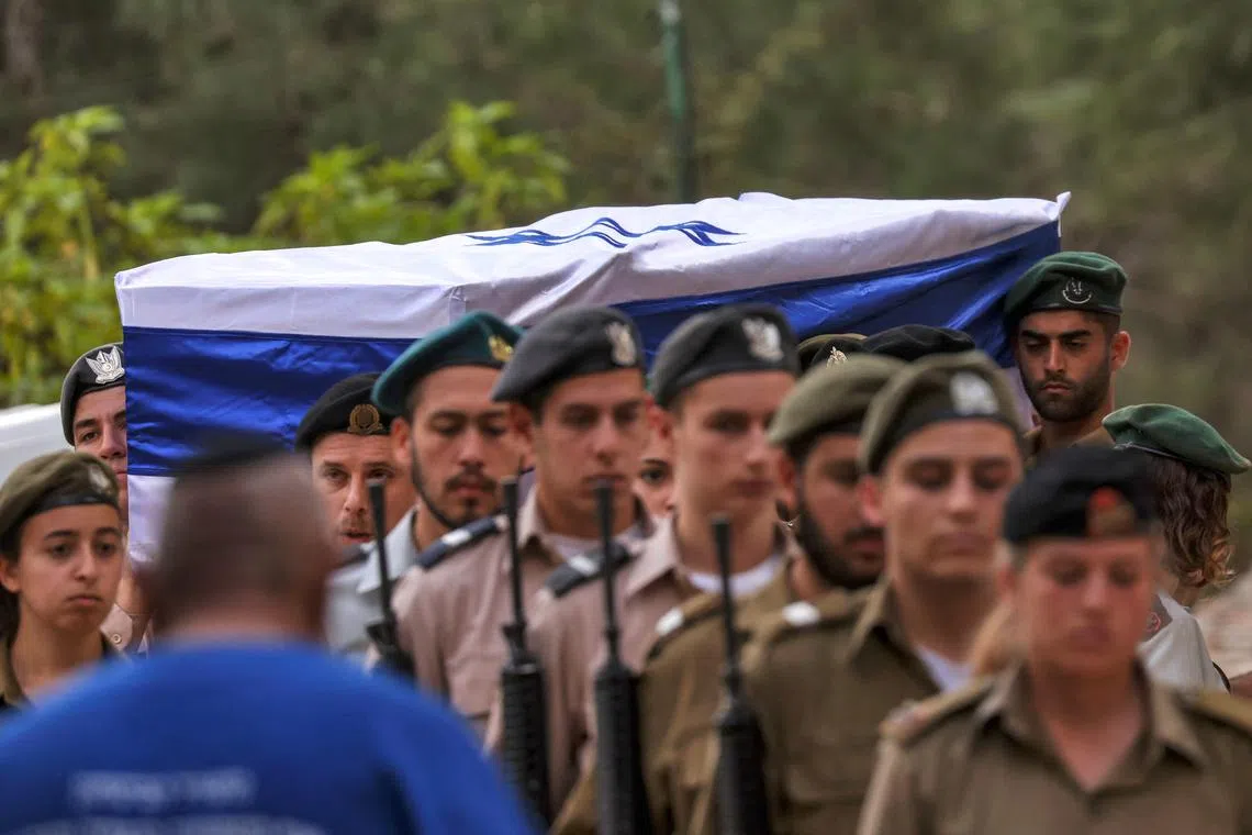 Soldiers carrying the casket of French-Israeli soldier Eli Valentin Ghenassia, who was killed in combat at Kibbutz Beeri during an infiltration by Hamas militants, at Mount Herzl cemetery in Jerusalem on Oct 12.