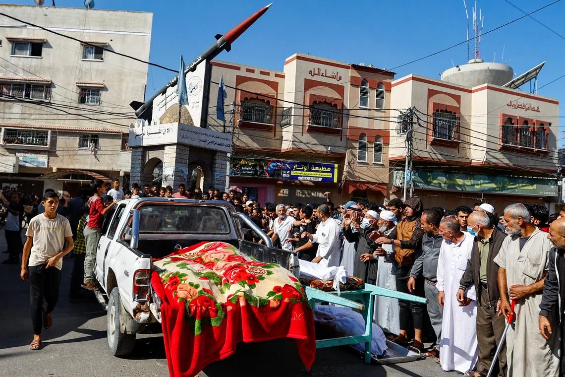 Mourners attending the funeral of Palestinians killed in Israeli strikes in Khan Younis, in the southern Gaza Strip, on Oct 13.