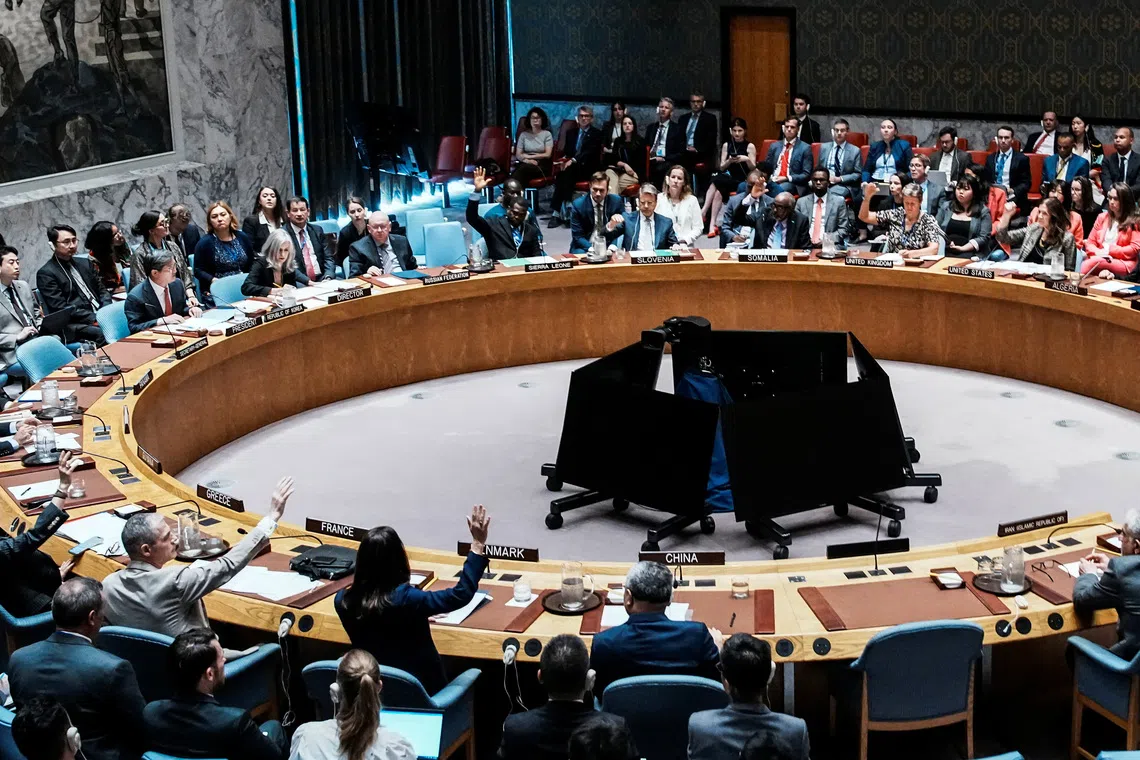 Members of the UN Security Council voting on a resolution that would permanently lift UN sanctions on Iran, on Sept 19.