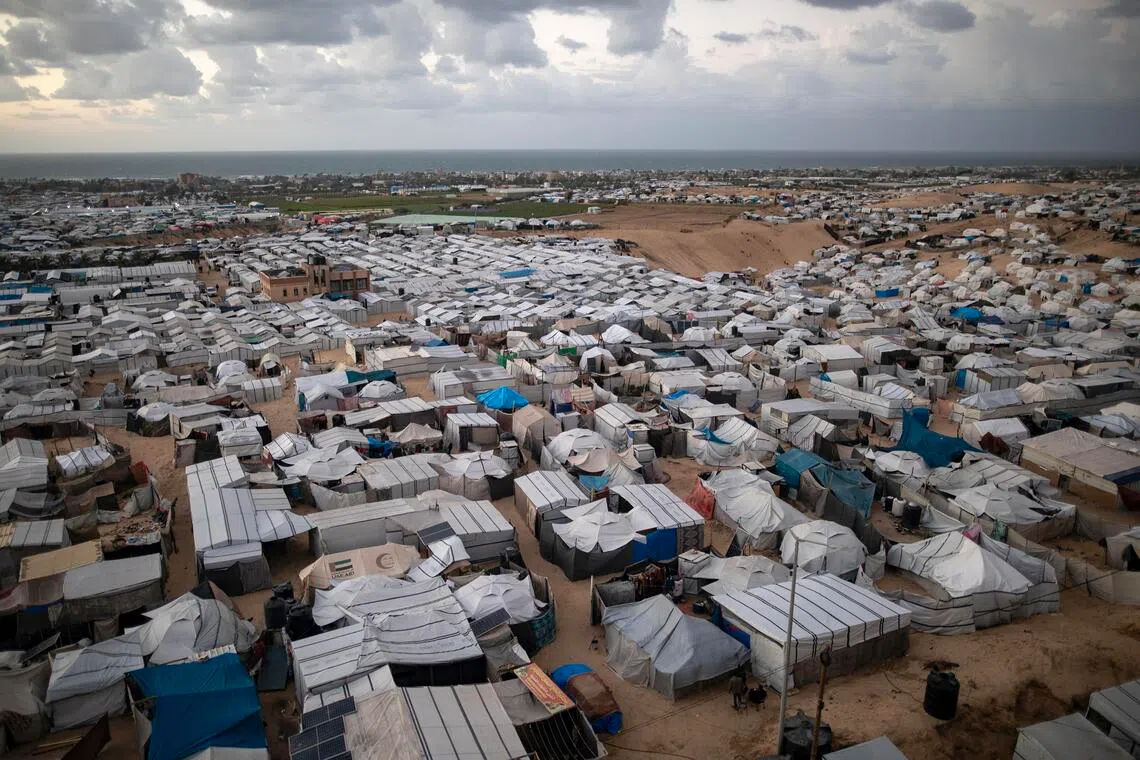 Tents of displaced Palestinians at a makeshift camp are soaked on a rainy day in southern Gaza.