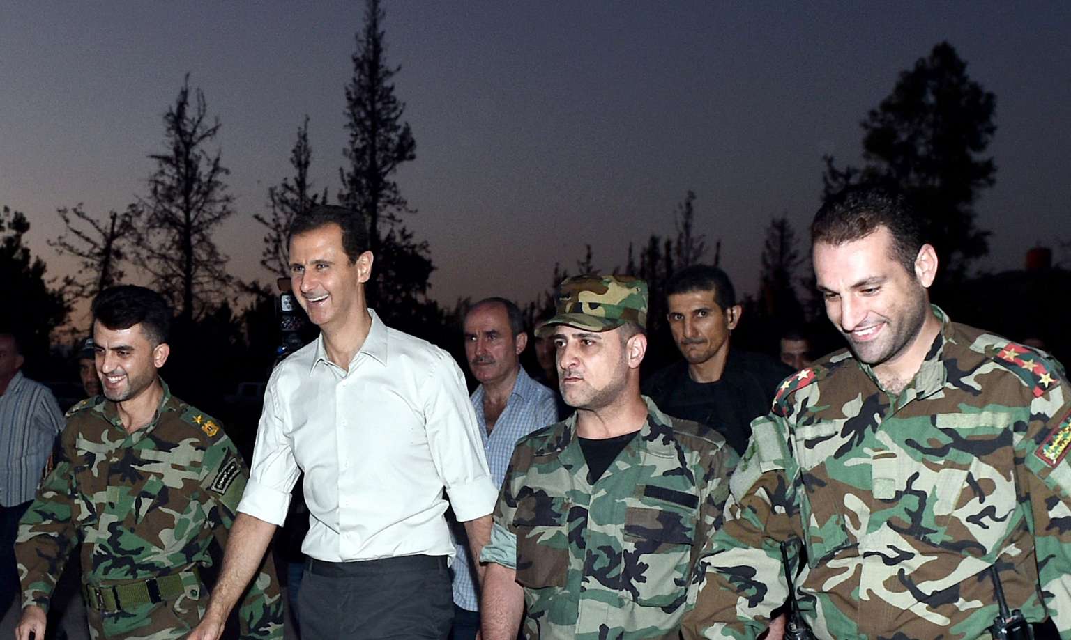 Syrian President Bashar al-Assad (second from left) meets with Syrian soldiers before he takes his Iftar (break of fasting) of Ramadan on June 27, 2016.