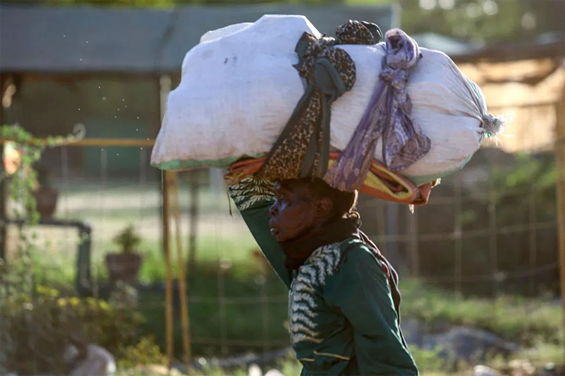 A woman carries her belongings as she flees amid fighting between the army and paramilitaries in Khartoum, on April 19, 2023.