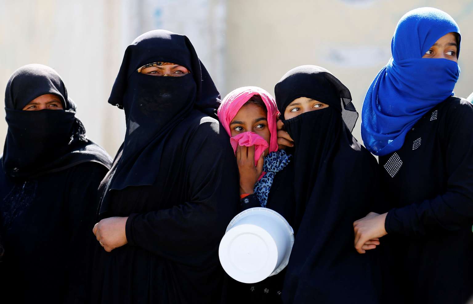 Syrian women line up for food distribution in the border town of Jarablus, Syria on Oct 19, 2016.