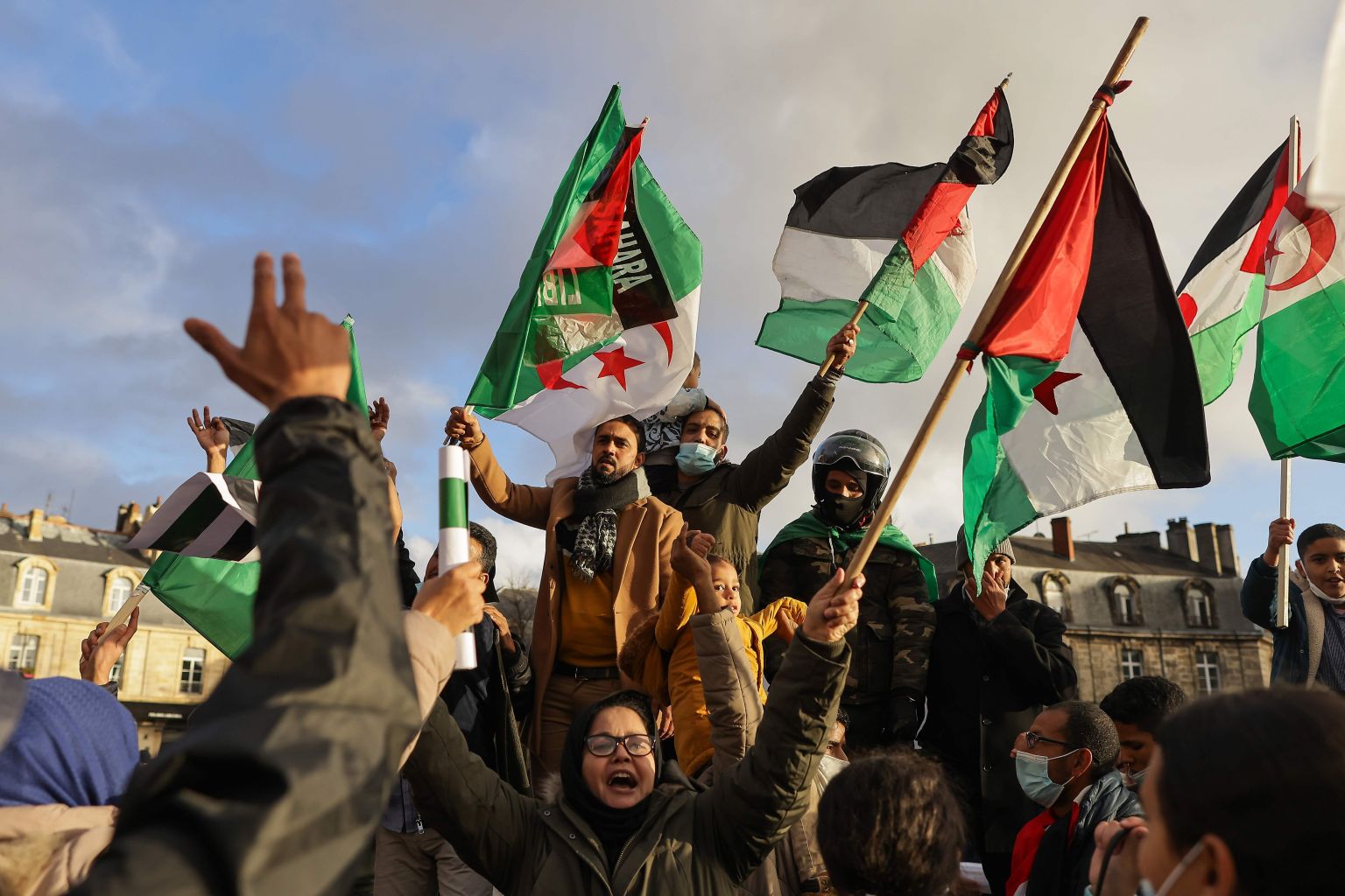 Protestors hold Western Sahara and Algerian flags during a demonstration in France on Dec 12, 2020.