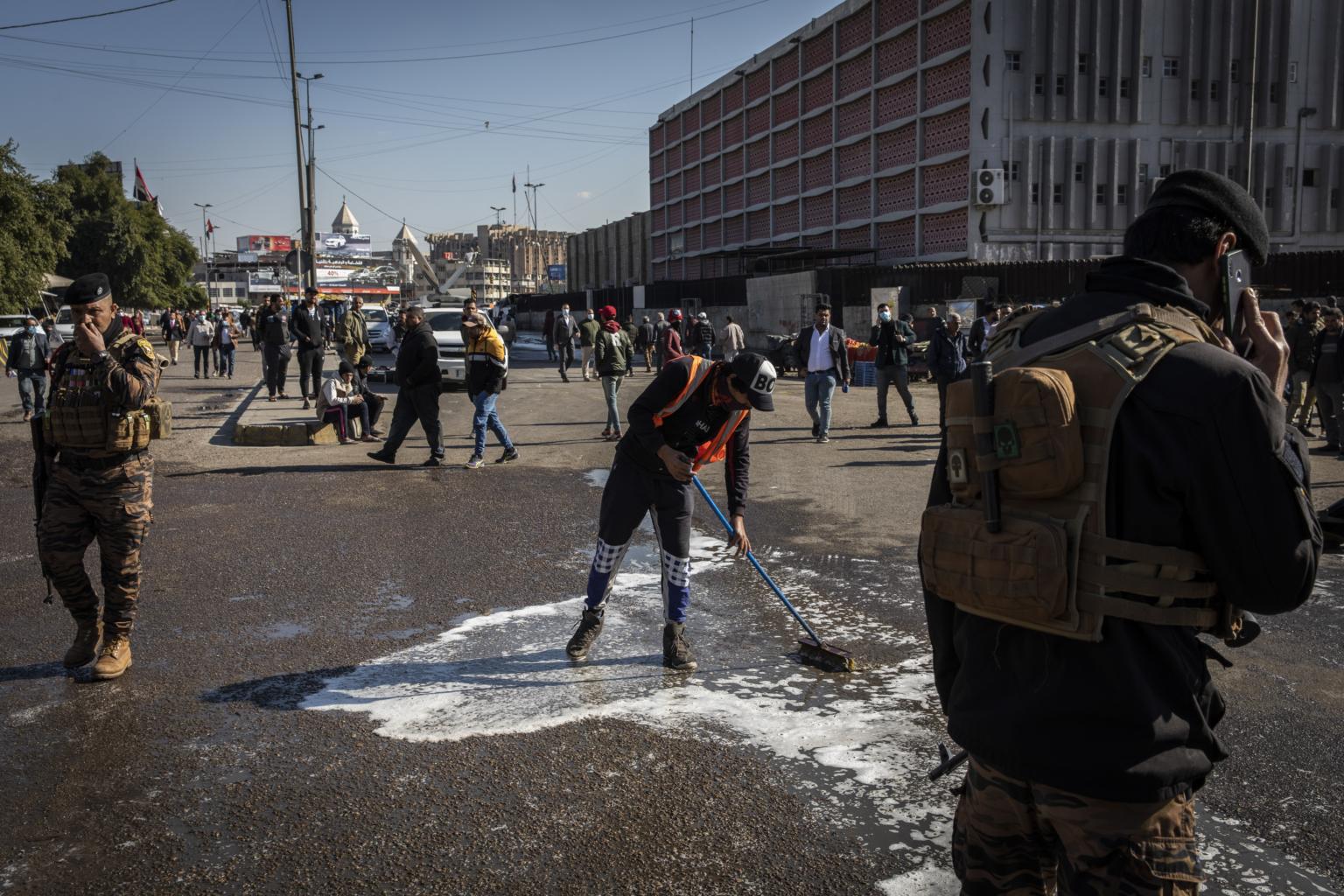 Workers clean a bloody street near Tayaran Square in Baghdad after a deadly double-suicide bombing on Jan 21, 2021.