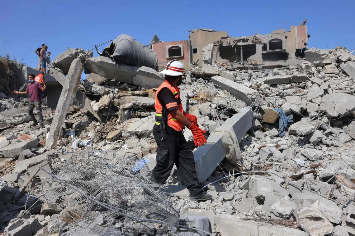 Emergency services personnel searching the rubble of destroyed buildings following an Israeli strike in Rafah, in the southern Gaza Strip, on Oct 12.
