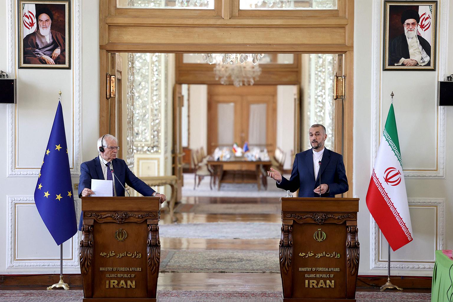 Iran's Foreign Minister Hossein Amir-Abdollahian (right) at a press conference with Josep Borell, the High Representative of the European Union for Foreign Affairs and Security Policy in Teheran on June 25, 2022.
